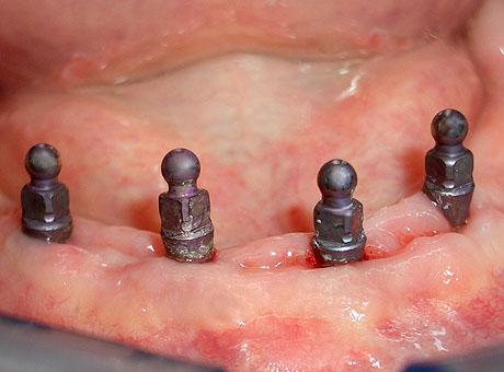 Nell'arcata superiore vennero inseriti sei impianti con tecnica tradizionale (in due tempi). Dopo il periodo di guarigione (osteointegrazione) di circa tre mesi, fu costruita l'overdenture superiore rimovibile tramite attacchi.